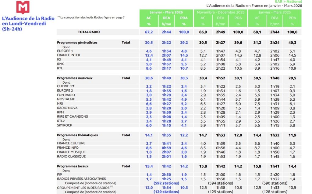 Mardi 14 avril 2026 – Médiamétrie a publié les audiences des radios (janvier /mars 2026).